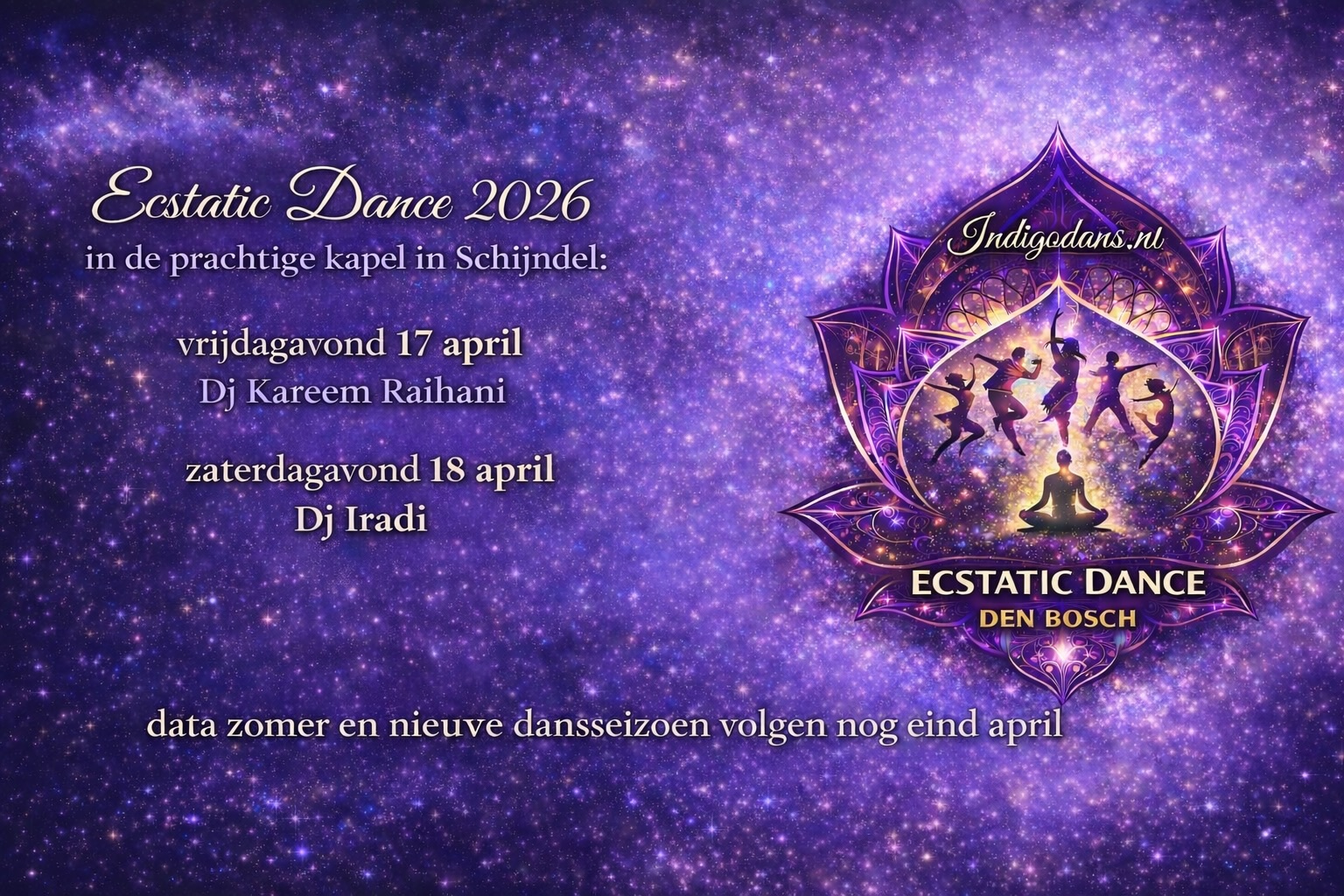 Deelname aan een event van Ecstatic Dance Den Bosch is geheel op eigen risico. Als u deelneemt aan een door Ecstatic Dance Den Bosch georganiseerd event gaat u akkoord met bovengenoemde voorwaarden.